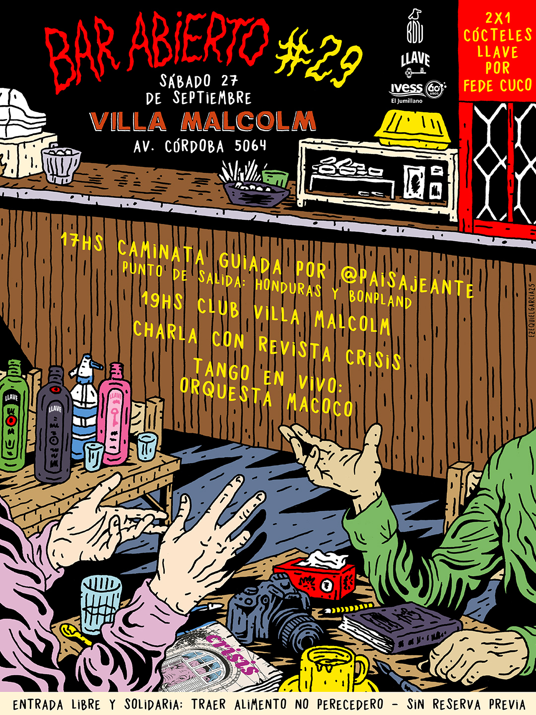 ***** Hola, ¿cómo estás? Mañana sábado 27 de septiembre será la última edición del año de Bar Abierto en Villa Malcolm que arranca como siempre temprano con caminata guiada por @paisajeante a las 17hs en Honduras y Bonpland y no se suspende por lluvia, para terminar a las 19hs en el Club Villa Malcolm, Av. Córdoba 5064, Villa Crespo. Esta vez tenemos encuentro con la Revista Crisis, una iniciativa editorial colectiva nacida en 2010, que se despliega en un sitio web, podcasts, newsletters y el corazón del proyecto: una publicación impresa bimestral. Vamos a conversar con Nicolás Perrupato y Ezequiel García por la Revista Crisis